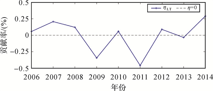 龙滩水库水储量变化(TWSCLT)的计算方法同式(2),其对区域陆地水储量变化贡献率可由式(3)估算。图 9为2006-2014年龙滩水库对红柳江区域陆地水储量变化贡献率,其值在-45.9%~29.2%范围内。2006-2008年水库蓄水,水库贡献率持续为正;2009年和2011年水库负贡献率较大,其原因为这两年降水量较少,而人类活动耗水量较多(图 6)。此外,龙滩水库蓄水完成后(2009年之后),水库贡献率正负交替,此现象可能与政府调控有关。