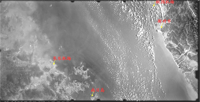 为了提高我国返回式摄影测量卫星的技术水平,20世纪90年代开始研制第二代返回式摄影测量卫星[4]。无论影像分辨率、相机像幅大小,还是有效载荷配置(增加星载GNSS接收机和激光测距仪),目标无控精度都比第一代有较大提高。测绘相机像幅为230 mm×460 mm,达到了美国大画幅相机(LFC)的水平,一张像片可覆盖约51 000 km2地球范围。同时,为了实现福建与台湾的摄影连接,摄影计划中专门进行了摄影策划,成功摄影到台海地区无云覆盖影像,而且是台海地区立体模型的完美覆盖,如图 1所示。图 1中像片中央都是水域,此时在摄影测量中称作“主点落水”现象,无法进行模型的连接。幸运的是在主点的下方,南日岛在框幅影像范围内,可以起到连接作用,将台湾地区和大陆的影像有机连接起来,建立了跨海峡摄影测量控制网,为实现海峡两岸控制基准统一奠定了基础。