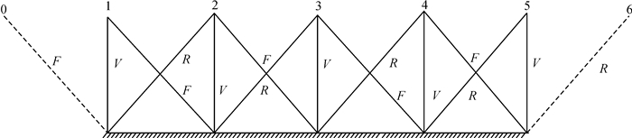 2.2.2 EFP全航线全三线交会光束法平差定向片法和EFP光束法平差都有共同的缺点,即对于航线两端的各一条基线范围内只能有两线交会,基高比减小,高程精度要比三线交会区高程精度低一半,严重影响无控定位的高程精度。如图 2所示,按4条摄影基线对应的地面段而言(大约1000 km),三线交会区覆盖两条基线(2—4摄影段),首末基线均为两线交会区(0—2和4—6摄影段)。