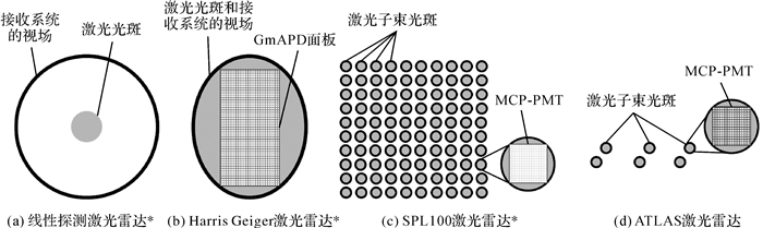 需要指出的是,线性探测激光雷达系统体系已颇为成熟,而光子计数激光雷达的民用测量系统还比较少,其中有3个代表性的系统在光子计数激光雷达体系中尤为重要。一是由Harris公司开发的Geiger模式激光雷达系统GmLiDAR,二是由Leica公司旗下的Sigma Space开发的单光子激光雷达系统(SPL100)[5, 25-26],三是搭载在美国NASA于2018发射的ICESat-2卫星上的ATLAS(advanced topographic laser altimeter system)。前两个系统目前都只实现了机载测量(具有在垂直于飞行方向上的扫描功能),而第三个是目前首个应用单光子探测技术的星载激光测高仪。这3个系统从激光发射系统和接收系统来看都有着很大的差别,如果把传统线性探测激光雷达描述为点发射-点接收的话,Harris的GmLiDAR可以被描述为点发射-面接收,而SPL100和ATLAS则为面发射-面接收。图 1从原理上简略描述了线性探测激光雷达图 1(a)和3个不同的光子计数激光雷达的激光发射系统和信号接收系统(图 1(b)、(c)、(d))。图 1(b)、图 1(c)目前尚未有相应的星载激光雷达。下文将从激光发射系统和信号接收系统两方面详细介绍光子计数激光雷达系统。