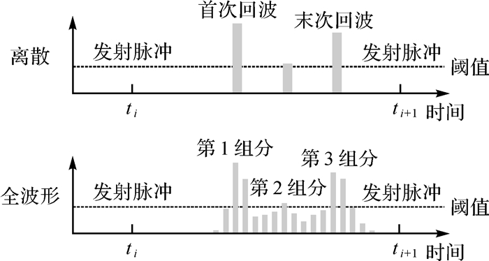 对接收到的回波信号,线性探测原理有两种不同的数据记录方式。因而,线性探测原理下的激光雷达也经常分为两类:离散激光雷达和全波形激光雷达。前者记录若干离散的回波信号,后者则以很小的时间间隔对目标接收到激光脉冲后返回的能量进行完整的采样记录[16]。