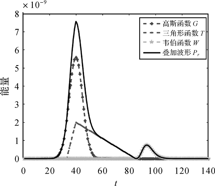 水深也可以使用全波形数据进行检测。如图 3所示,文献[117]用高斯函数、三角形函数和韦伯(Weibull)函数的叠加来拟合发射脉冲经过水体反射的回波波形Pr(t)