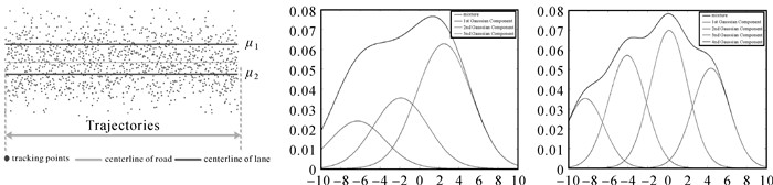 在车道级道路精细识别方面,基于众包轨迹的提取方法一般分为3个步骤:①基于1.1节中介绍方法,对原始轨迹的噪声进行滤选;②推断出GPS轨迹所在的车道位置;③利用交通道路规则等对车道的几何形状进行重建[44]。例如,文献[45]提出了一种基于朴素贝叶斯分类的车道数量探测方法,并获得了约为84%的精度;文献[46]提出了一种利用众包轨迹数据构建车道信息的方法CLRIC(图 3):首先采用区域增长聚类方法对原始轨迹进行过滤,得到高精度的GPS数据;其次,通过优化的约束高斯混合模型对交通车道的数量及位置进行挖掘。