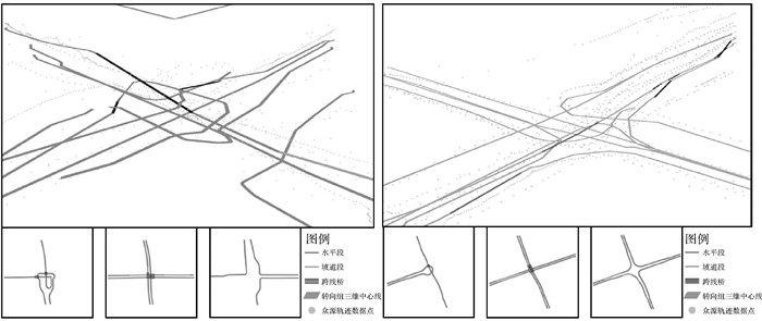然而,目前利用众包数据进行道路场景三维制图的研究少之又少,更别提立体交叉口提取。现有方法主要在二维道路网络的基础上,借助轨迹高程分割、车辆俯仰角等方法获取高程变化信息,进行三维道路结构的重建。例如,文献[64]将车辆的俯仰角与2D交通地理信息系统(GIS-T)数据库中的道路高程计算出的倾斜角进行比较,以便在车辆进入或离开多层次道路网络(例如立交桥、高架路等)时将其锁定在正确的道路层级上。文献[65]提出了一种从车辆轨迹中提取立体交叉口三维结构的方法(图 4):通过检测变化点,将轨迹分为不同高程趋势的段;利用数据融合技术寻求不同轨迹之间的共识,得到斜坡和水平截面的范围和高程;并基于语义分割和聚合提升算法,重建详细的三维连接结构。