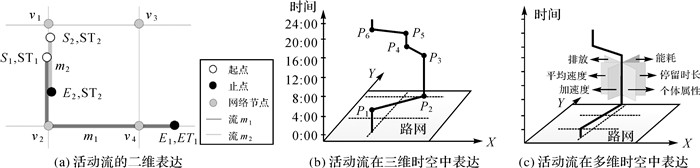 在二维表达的基础上(图 5(a)),为了反映出活动流空间位置和属性特征的时空协同过程,需要对道路网络活动流在三维乃至多维空间中进行表达。图 5(b)所示为个体活动流在时空三维坐标系下的表达,通过将个体的移动表达为时空路径,可以反映活动流的位置随时间的变化情况;图 5(c)为道路网络活动流的多维表达,多维时空表达不仅能够反映活动流的时空特征,同时能够直观地表达活动流的多种属性,例如速度、能耗、污染物排放等。