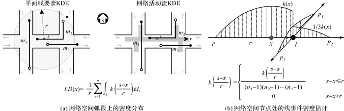 为了能够准确度量发生在道路网络空间中流事件的密度、全面分析流事件在网络空间中的分布模式,文献[90]提出了道路网络活动流的核密度估计方法。该方法首先构建了活动流密度分布函数,并分析单个流事件在道路网络空间中的密度分布;然后考虑到网络方向和拓扑关系估计道路网络空间的流密度,并顾及网络节点处密度计算的特殊情况,实现了道路网络流密度的精确估计,如图 6所示。