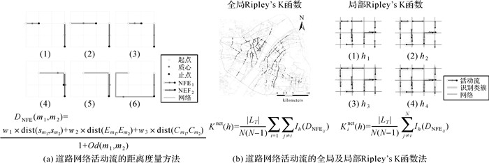 文献[99]提出了一种适用于发生和分布于道路网络空间中、连续分布的网络流事件的多尺度聚类分析方法——道路网络活动流的Ripley's K函数分析方法。该方法在顾及网络活动流的整体性和网络拓扑与方向性的基础上,发展网络活动流事件的空间距离度量方法, 实现了网络空间流事件之间的距离度量,如图 7(a)所示;在此基础上,构建了网络活动流多尺度聚类分析Ripley's K函数(NRK-F),包括全局多尺度聚类分析Ripley's K函数(global NRK-F)和局部多尺度聚类分析Ripley's K函数(local NRK-F),如图 7(b)所示;最后讨论了网络空间背景下流事件的随机模拟方法,并分析了流事件在网络空间中的分布模式。