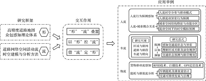 基于上述构建了高精度道路地图众包感知理论体系和道路网络空间活动流建模方法,下列阐述了静态基础设施“形”结构与动态活动行为“流”模式的交互方式及具体应用。总体而言,道路场景高时空分辨率感知应用非常广泛,主要交互方式包括: