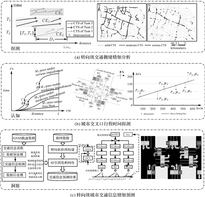 然而,目前在车道/转向尺度上的交通状态研究仍然较少,极大程度上依赖于车道级高精度交通数据。车道级方面,文献[136]利用车道级线圈与交通信号灯数据探测车道级拥堵路段;文献[137]通过考虑车辆换道、转向和直行等不同行车特点,建立车道级路段行车代价模型,提出了一种分层路径轨迹搜索方法,以支持自动驾驶的车道级轨迹规划。转向级方面,文献[138]提出一种基于出租车GPS轨迹的转向级交通拥堵事件感知方法,用于分析交叉口不同转向的拥堵时间、拥堵强度和拥堵距离等转向级精细交通拥堵状态(图 9(a));文献[89]利用低频时空GPS轨迹数据,分析了交叉口的不同通行模式(左转、直行和右转),动态确定不同通行模式下的交叉口范围,建立了不同转向下通行时间的模糊回归模型,实现了对交叉口通行时间的准确探测(图 9(b));文献[139]利用低频GNSS轨迹数据,提出了基于图卷积网络的转向级交通流预测方法(图 9(c)):首先,顾及轨迹点间车辆运动模式,提出一种排队起始点估计模型;其次,基于对偶图理论构建转向连通关系的图结构;最后,基于图卷积神经网络提出一种顾及转向时空模式的交通预测模型。