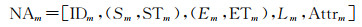 其中,NAm表示第m个道路网络空间活动流;IDm表示第m个道路网络空间活动的编号;Sm、STm分别表示为活动事件发生的起始位置点和时间;Em、ETm分别表示为活动事件发生的终止位置点和时间;Lm用来描述活动的发生过程;Attrm表示其语义属性,如活动目的、活动模式、类型等。