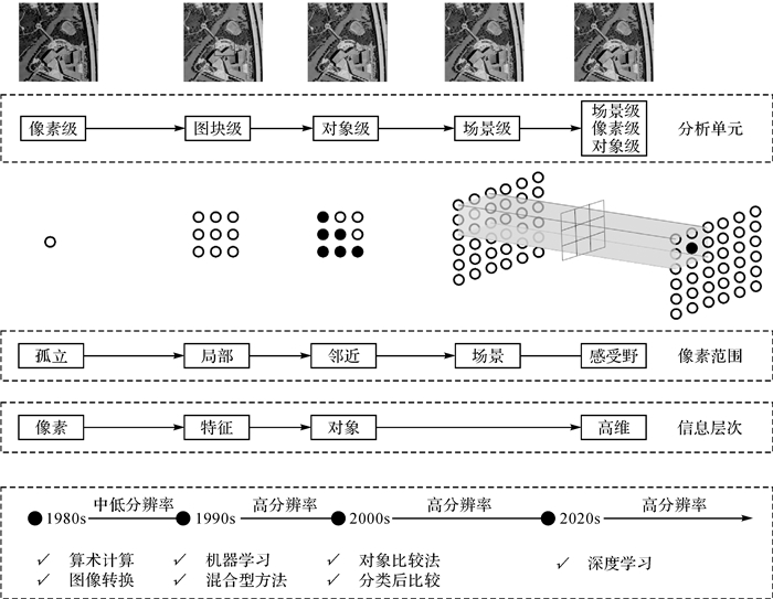 20世纪80年代以来的变化检测方法是从数据源、像素分析单元、信息利用层次及年代历程等维度的归纳。如图 2所示,分为4个典型的发展阶段:①基于中低分辨率影像的像素统计分析时期;②基于高分辨率影像的特征建模时期;③基于高分辨率影像的面向对象分析时期;④基于深度学习的高分辨率影像变化检测时期。