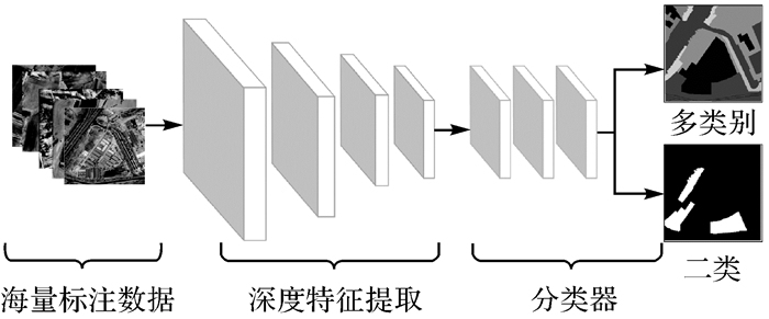 区别于常规机器学习方法,深度学习是具有多隐层的人工神经网络,能够从海量标注数据中发现和学习影像中地物目标的几何结构和上下文关系,并将特征模型从传统的人工设计特征转变为机器自动学习深度抽象特征,结合分类器通过多层非线性网络实现地物的自动化识别和推理[101],进而完成变化检测,见图 3。原有机器学习方法多在中小规模的数据上追求精度和效率,需要研究数据的先验特性,并把它添加到特征学习中学习得到可判别性的典型特征,包含特征学习和分类器/回归器设计两个重要环节。深度学习则是在大规模的数据上尽可能采用统一的端到端的设计方式,直接获得从数据到标签(如是否变化)的映射。在摄影测量应用中,近年来人们构建大量遥感影像样本库,利用深度学习技术服务于变化检测、土地覆盖等任务,显著提高了遥感影像特征利用效率。本文根据检测粒度按照场景级、像素级和对象级[102]对当前基于深度学习的变化检测方法进行介绍。