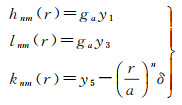 式中,y1、y3、y5分别表示Y中的垂直位移、水平位移和附加引力位分量,对于有直接引力项的力源δ=1(如地表质量负荷),其他力源δ=0,n和m分别是球谐展开的阶和次。对于地表负荷问题,m=0;对于位错问题,m=0, 1, 2。这样,就可得到格林函数