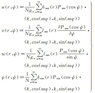 式中,u、v、w、ϕ分别为垂直位移、切向位移、横向位移、附加引力位;N为构建边界条件时的规格化系数;Pnm为Legendre函数;ψ是计算点到源点的角距离;φ是方位角;最右边的括号适用于位错问题,kc和ks是某个常数,至于是取余弦还是正弦取决于不同位移场分量与位错模式[17-18]。
