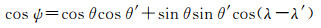 式中,a是地球半径;θ和λ分别是计算点的余纬与经度;θ′和λ′分别是源点(即负荷作用点)的余纬与经度;ρ是海水或陆地水密度;H是海潮潮高或海面高变化量或等效水高;u称为垂直位移的格林函数;ψ与源点和计算点的坐标满足式(5)