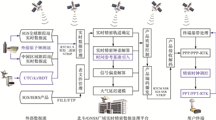 | 图 1 广域实时精密定位与时间服务系统流程 Fig. 1 Diagram of WPP/WPT service system |