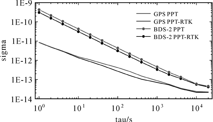 图 10进一步采用重叠阿伦方差评估了接收机钟差稳定性,对于GPS而言,PPT-RTK相对于PPT估计结果略有提升;对BDS-2而言,PPT-RTK模型的稳定度明显优于PPT模型,其提升约为27.8%。对比GPS和BDS-2,GPS静态精密授时精度要高于BDS-2,两者的万秒稳定度分别达2.14E-14和5.56E-14量级,短期项稳定度GPS比BDS-2高1~2个量级。