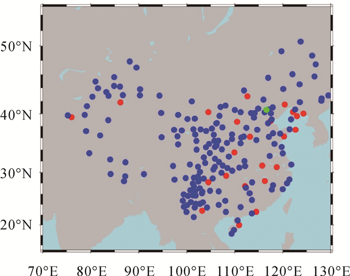 2 试验分析根据上述分析,时间基准的选择并不影响广域实时系统定位及时间同步服务,然而PPP、PPP-RTK单向授时精度却受限于时间基准的稳定性。为验证本文广域实时精密定位与时间服务系统产品精度与终端服务性能,本文采用FUSING软件实现上述时间基准约束算法,并引入模糊度固定及大气增强技术,用于系统数据处理服务。目前FUSING已发展为集多系统实时滤波定轨、实时钟差与信号偏差估计、大气延迟建模与监测等于一体的综合性业务化软件平台[11, 36-37]。本文采用系统2022年1月25日至29日实时输出轨道、钟差产品,再结合实时数据流存储观测数据,通过事后仿实时处理得到相位偏差及电离层延迟产品,并基于上述产品实现定位与钟差解算,分析系统产品精度以及系统服务性能。其中实时轨道产品基于全球IGS实时数据流解算,测站分布如图 2所示;相位偏差及电离层延迟基于中国区域分布部分陆态网与北斗地基增强网实时数据流解算,测站分布如图 3蓝色部分所示;图 3红色所示站点为34个用户定位站;图 3绿色所示站点为1个用户时间服务站,该站时钟类型为外接UTC(NIM),具有稳定的时频参考。