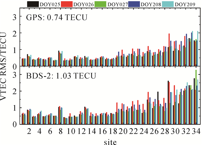 为评估实时电离层模型精度,通过34个用户站固定坐标,采用后处理模式反算电离层为参考,截止高度角设定为15°。图 6为电离层内插残差RMS值,测站按纬度从高到低排列,可以看出,由于低纬度地区电离层更为活跃,其改正精度低于1TECU。对比GPS和BDS-2,其电离层改正精度分别为0.74、1.03 TECU。