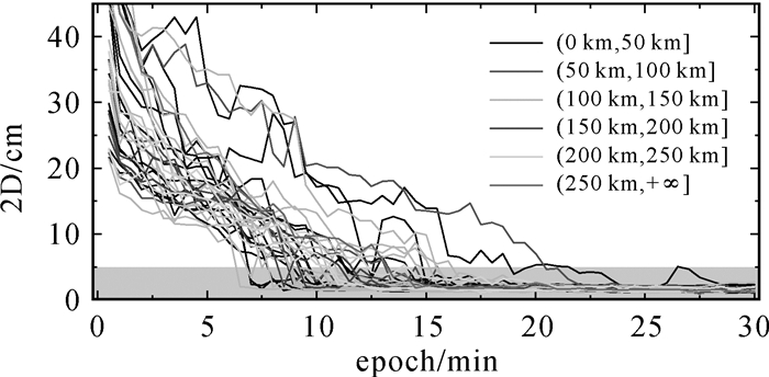 对图 3红色所示站点,采用PPP和PPP-RTK两种策略进行定位分析,定位每小时重启一次。图 7是68%水平定位误差的时间序列,可以看出平面方向收敛速度PPP-RTK相较于PPP有显著的优势,收敛至5 cm所用时间从半小时缩短至10 min。图 8进一步根据图 3中红色测站离最近基准站(图 3中蓝色测站)距离,采用不同颜色给出了不同站PPP-RTK定位68%收敛时序图。由图 8可以看出,由于本系统中国区域电离层延迟采用广域星基建模实现[35],因此不同跟踪站收敛序列与其离最近基准站之间距离没有明显相关性。