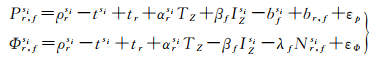 式中,Pr, fsi、Φr, fsi分别为以距离为单位,频率f∈{1, 2, 3}上接收机r至卫星si∈{s1, s2, …, sn}的伪距和相位观测值;ρrsi=|rsi-rr|为对应几何距离;tsi与tr分别为卫星与接收机钟面时与“真实”时间之差;TZ为天顶对流层延迟,αrsi为对应投影函数;IZsi为卫星si天顶电离层延迟,以TECU为单位,