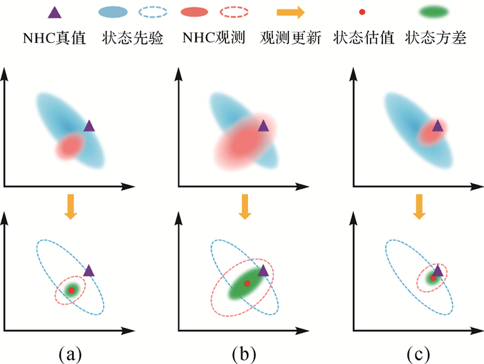 图 1表示了NHC虚拟观测、真实观测及更新过程之间的关系。图 1(a)表明,当虚拟观测设为零且观测方差不做调整时,NHC误差椭圆无法包含真实的NHC观测值,最终的状态估值将偏离真实状态。因此,现有的改进方法往往是放大NHC的观测方差,使得膨胀后的误差椭圆能够包住真实的NHC观测值,即图 1(b)所示,这种方法是在方差域进行参数调整,虽然估值已经在接近真实状态,但是最终估值的状态方差会变大,表明估计精度不好。因此,本文从观测域出发,直接调整NHC观测值,而固定其观测方差,这种新思路更符合实际情况,如图 1(c)所示,这种方法更新得到的估值最终接近真实状态,且其误差椭圆也较小,表明该结果具有较好估计准确度(accuracy)与精度(precision)。