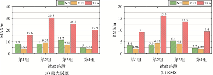 如图 11所示,将第一种多元回归模型、深度学习模型和传统模型进行比较,在全部4组试验路段中,深度学习模型的水平位置最大误差相较于传统方法减小了49.4%~74.9%,水平位置误差RMS减小了60.0%~77.3%,并在第2组试验路段略优于多元回归模型。