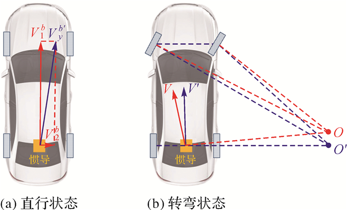 1.3 车辆非完整性约束分析在实际车辆导航中,车辆运动状态、车身振动、惯导安装位置以及安置角度等影响因素,使得车辆侧向和垂向速度为零的这一假设条件无法满足,导致NHC虚拟观测值存在误差,从而影响惯性误差推算的抑制效果。