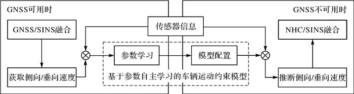 基于参数自主学习的车辆运动约束模型构建的整体思路如下:当GNSS观测条件良好时,训练车辆侧向/垂向速度与影响因子之间的映射关系;当GNSS不可用时,通过学习得到的映射模型推断车辆侧向/垂向速度,形成NHC约束信息,具体实施过程如图 3所示。