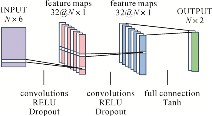 如图 5所示,该神经网络为一维卷积神经网络,共设计两层。其中输入为N×6大小的二维矩阵图像,由连续N个历元的惯导六轴数据形成。第一层卷积核大小为5,输出维度为32,膨胀系数为1,每个维度上经过卷积和边界填充后变为N×1的向量。第二层卷积核大小为5,输出维度32,膨胀系数为3,边界填充及不同卷积结果组合的过程与第一层相同。两层之间的激活函数均采用ReLU函数,每层的Dropout系数为0.5。然后通过全连接层进行维度变换,输出侧向速度和垂向速度的二维结果,该结果与惯导数据采样率一致,实际使用中可对其进行降采样处理再用于组合导航滤波解算。
