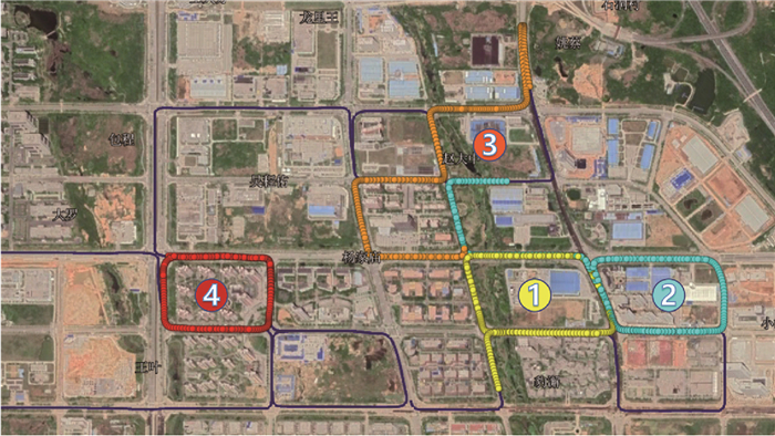 | 图 6 车辆行驶轨迹及选取的4组试验路段 Fig. 6 Vehicle track and 4 test roads |
