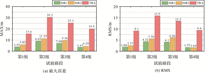 4组试验路段的统计指标如图 9所示,相比于方差域调整参数的传统方法(TRA),在观测域进行多元回归的新模型具有显著的精度提升,由于第一种多元回归模型(MR1)考虑了更多变量因子,其约束效果普遍优于第二种模型(MR2)。此外,相比于传统模型,第一种多元回归模型的水平位置最大误差减小了70.2%~82.1%,水平位置误差RMS减小了69.6%~81.2%。