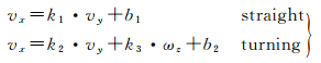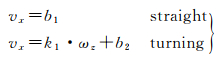 式中,vx、vy分别是车辆的侧向速度与前向速度;ωz是通过陀螺Z轴输出得到的角速度;系数k与b是在GNSS可用时在线拟合确定的参数。考虑到有些车载导航系统可能无法获取CAN总线的车辆速度信息,因此提供了第二种不依赖于前向速度的拟合模型。