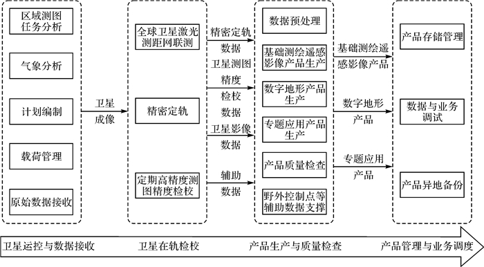 | 图 2 光学测绘卫星数据获取与处理流程 Fig. 2 Flowchart of data acquisition and processing of optical surveying and mapping satellites |