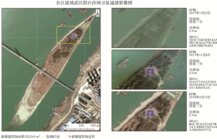 | 图 8 白沙洲非法违建案件调取ZY-3卫星影像资料 Fig. 8 ZY-3 satellite image data for illegal construction cases(Bai sha sandbar in Wuhan City) |