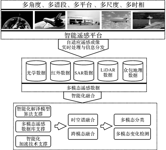 面对多源多模态遥感数据所呈现出的信息互补、冗余、异构等特点以及单一模态在复杂场景下表现出的稳健性低、识别精度低等突出问题,亟须研究多模态多源遥感图像的智能融合方法(图 1),从而有效利用复杂场景下多模态数据的多样性,更好地服务相应的需求。