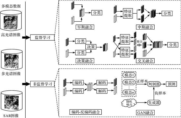 不同于无监督的深度网络构造,文献[20]首次提出了应用于遥感图像分类的多模态深度学习网络框架,突破了单模态性能瓶颈,为多模态智能解译提供了新的视角,如图 3所示。其框架能够处理不同的数据输入形式,包含了两种不同的网络结构:像元级别和图斑级别。与此同时,多模态融合对于深度学习网络的性能提升具有重大意义。相比于传统基于单模态的深度网络框架,多模态融合旨在整合不同单模态特征,并将其抽取成一个稳定的多模态特征,为深度学习网络赋予了更完备的特征信息。在融合策略上,考虑到多模态特征融合位置的重要性,介绍了3种常见的融合策略:早期融合、中期融合、决策融合。早期融合主要发生在数据输入端,通过联合处理不同模态的遥感数据源来发挥数据原始信息的价值。中期融合将每个模态所提取到的特征联合起来,使得深度学习网络学习到不同的特征表示,但是其难点在于需要考虑合适的特征融合时机。决策融合充分结合多模态网络结构的决策输出,可以针对具体决策目标实现灵活的判别功能。考虑到不同模态数据异质性所带来的融合不充分问题,设计了跨模态交叉融合新思路,将多模态数据分别投影到一个可度量的潜在共享空间,缩减了模态数据间的语义鸿沟,更充分地融合了不同数据的物理属性,有效地提升了特征的判别性,大大提高了地学分类应用的性能。文献[37]利用交叉通道重构模块来交换多模态遥感数据信息,并成功应用于遥感图像分类领域。相比于传统基于级联和基于对齐的融合方法,这种交叉融合方法能够更加准确地提取多模态特征。
