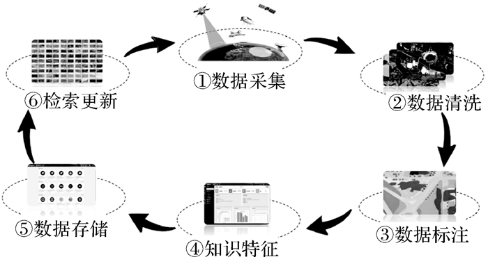 整体技术流程包括数据采集、数据清洗、数据标注、知识特性、数据存储、检索更新6个环节: ①采集包括来自国内外的天基卫星、临近空间飞艇和航空飞机等多个平台、全色/多光谱/高光谱/SAR/红外等多类传感器,以及众包地理等数据;②通过设定的清洗规范,对数据规范性、完整性等进行评估和过滤筛选;③采用人机协同等多手段对多源数据实现细粒度标注;④利用数据关联等多种方式进行知识与特性的积累;⑤将样本通过统一的组织规范进行存储;⑥构建精准、高效的智能检索框架,支持样本迭代更新,提升数据的利用价值。整个流程可根据现有样本库内的数据分布,进一步开展针对性的数据采集、清洗、标注等工作,达到循环往复的效果。