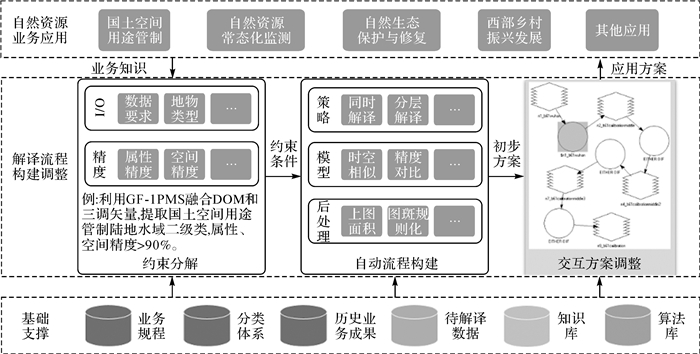 (1) 深度贴合应用方案的多手段交互定制构建。遥感智能精准应用平台通过定制化方案实现对复杂场景和多样任务的适应性。以自然资源领域的遥感智能解译任务为例,面向不同的目标地类、任务区域、影像数据等信息,在结合已有业务知识和成果的引导下,通过智能交互对解译需求进行粒度分解,形成可直接指导智能解译任务的执行方案。基于当前自然资源行业普遍采用的人机交互解译模式,可在任务I/O和精度要求下,分解从数据、模型和后处理等环节的业务模块,形成交互调整后的解决方案。首先,根据应用场景、任务类型、数据分辨率、数据类型、最低性能要求、最低时间要求、最终输出形式等内容对解译任务进行细粒度分解。其次,从基础数据支撑库中提取已有的数字业务模块,分析能否构建深度贴合任务需求的解决方案,明确哪些能直接智能支撑,哪些需要人机进一步交互等。最后,将各智能模块进行组装、拼接,支持人工交互调整,形成整体性的应用解决方案。
