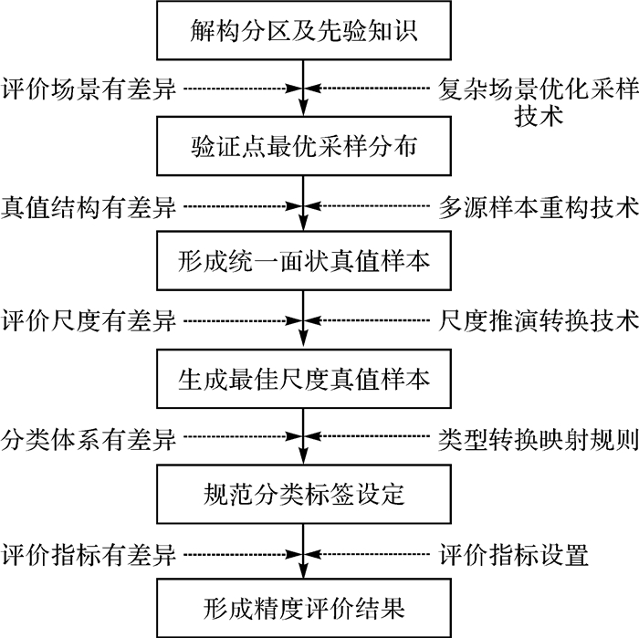 针对复杂自然场景地表真值在不同尺度、不同场景下可能呈现的多解性问题[83],本文提出了多层次多尺度精度验证策略,如图 8所示。综合考虑实地调查、人工解译以及历史成果收集等手段获取的多源地表真值数据集,分析地表真值随观测尺度的变化特征,研发地表相对真值概率表达模型及多尺度真值样本重构技术,并构建多尺度地表真值样本分类分级框架、多尺度重构规则以及面向复杂场景的真实性验证的样本优化采样策略[84];此外,针对地物目标自然属性和利用属性解释框架的差异性,建立复杂自然场景下面细类与大类转换分析规则,实现真实性验证样本可适配不同类别划分体系,形成大模型智能解译结果的精度验证技术及软件工具。