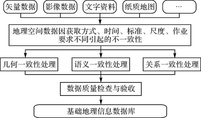 | 图 1 多源地理空间数据一致性处理流程 Fig. 1 The flowchart of consistency processing of multi-source geospatial data |