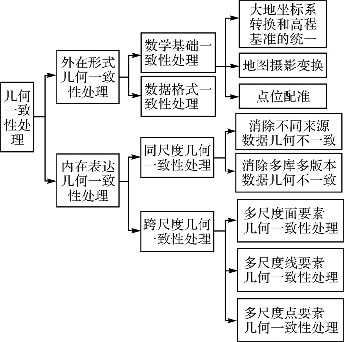 1 几何一致性处理多源地理空间数据要素和实体的几何特征主要表现为其位置和形状。一方面地理实体本身在不同时间下具有不一致的空间表现;另一方面地理实体在抽象为地理数据过程中的实体抽象和信息重构会带来要素空间的移位,因此多源地理信息数据不可避免地存在空间上的几何不一致。几何一致性处理就是要解决和消除多源地理空间数据中同名要素和实体几何特征的差异,包括外在形式的几何一致性处理和内在形式的几何一致性处理两方面,如图 2所示。其中,外在形式的几何一致性处理属于数据在表面上的对齐和位置上的对准;内在形式的几何一致性处理则重点解决多源地理空间数据中同名实体的位置修改和形状调整。进行几何一致性处理的基本思路是先进行外在形式的几何一致性处理,对地理空间数据进行集成对准后再进行内在形式的几何一致性处理,以得到空间定位上更可靠、形状更一致的地理空间数据。