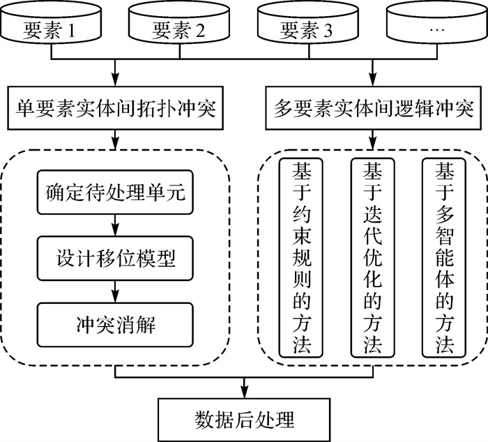 总体来说,现有单要素冲突算法研究较多,但是算法较孤立,未能系统化、整体化对空间冲突机理进行分析;多要素协同问题研究仍然不够透彻,对协同的内在机理、协同关联方式、协同强度等问题研究仍然不足。空间冲突作为一个系统性、整体性的问题,需要多层次、多尺度的协同冲突处理方法解决。