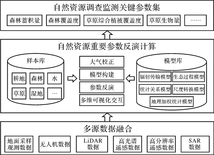 针对草原植被覆盖度、森林生物量等参数调查需求,依据我国显著的地表分异性规律和专项调查参数年际变化规律[36],构建面向自然资源关键参数的各类样本库,以及辐射传输、生态过程[37]、尺度转换、统计关系等模型库,综合利用长时间序列地面调查样地数据、星载和机载光学、SAR、LiDAR、高光谱等多源数据,通过大气校正、模型构建、参数反演、多维可视化交互等处理,实现不同草原区域、森林区域融合星天地数据的植被覆盖度、森林生物量等参数高精度反演和产品生产[38],如图 11所示。