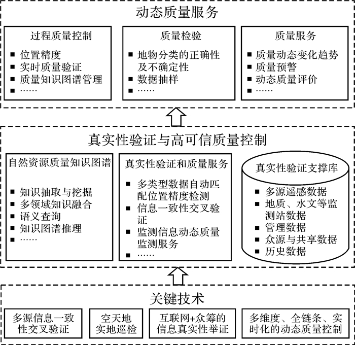 2.6 高可信质量控制与真实性验证为确保调查监测的数据质量,围绕数据多样性、流程复杂性及人为因素等质量问题产生的根源,建立集自然资源时空信息、生态环境知识、人文地理知识等为一体的自然资源质量知识图谱,构建集卫星遥感、无人机遥感、众源、互联网大数据、监测站点、样地样本、外业巡查等数据为一体的调查监测真实性验证支撑库,突破海量时空信息与自然资源信息的一致性检查、基于知识图谱与支撑库的多源信息交叉验证、互联网+众筹的信息真实性举证、空地结合的实地巡检等多模式验证技术[39-40],为各项调查监测提供实时、动态、可靠的质量信息与质量预警服务,如图 12所示。