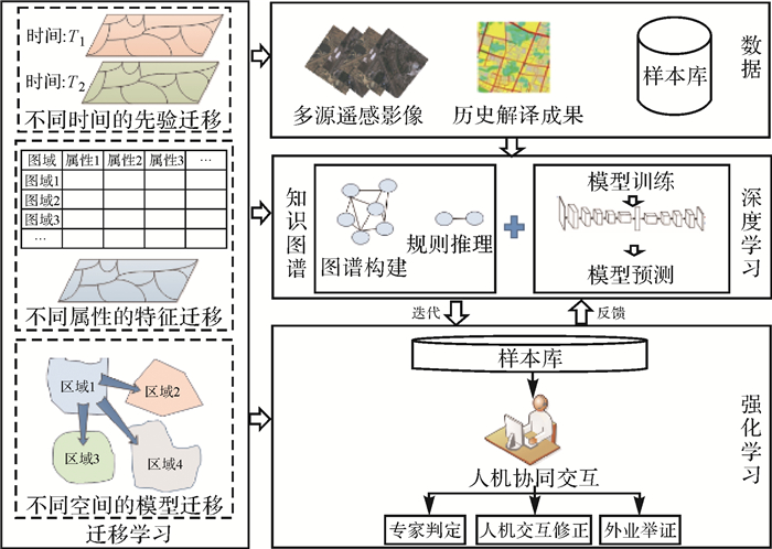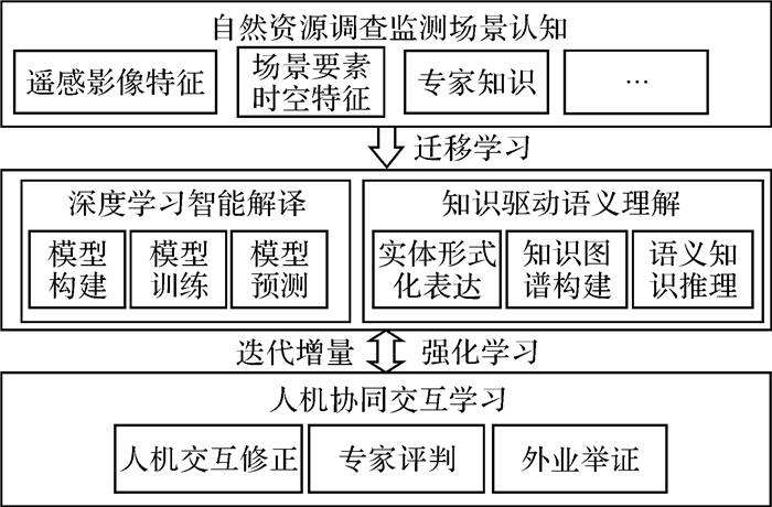 深度学习自学习能力强、适应力强、可移植性好,迁移学习对数据及标签的依赖性小,强化学习具有自我改进、推理决策等能力,知识图谱具有知识推理的高可信度、强解释性等优势,这些人工智能技术是实现智能认知的核心驱动力,综合利用各种方法的优势能够为知识驱动的智能解译提供技术基础。因此,在深度学习、迁移学习、强化学习、知识图谱等技术支撑下,从自然资源调查监测场景认知出发,构建自学习、可解释、可扩展、能推理的要素解译智能认知框架与智能解译系统(图 2),是推动遥感影像解译智能化发展的核心驱动力。