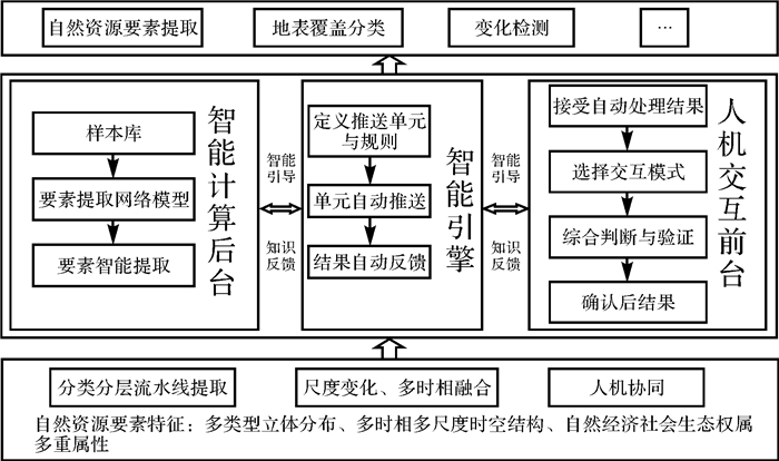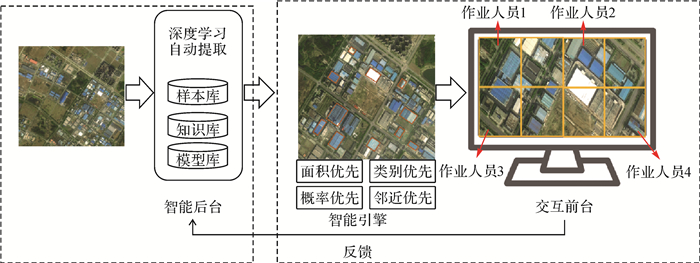 2.3 人机协同智能解译针对解译模型算法与应用需求结合不紧密、地类解译不准及边界无法满足业务需求等问题,构建面向应用场景的人机协同解译环境与模式,研究“智能计算后台+智能引擎+人机交互前台”的人机协同智能提取技术框架[2, 32],如图 6所示。后台运用深度学习等方法进行智能计算,将自动提取结果通过智能引擎推送到前台;前台利用半自动提取、人机交互采集编辑技术手段进行人机交互式综合判断与验证。这一方法通过人类与智能机器共同协作,利用自动化技术使大部分业务流程实现自动化,利用人类视觉感知及认知决策技术进行综合判断与验证,反馈给机器,提升机器智能水平,从而实现人的解译知识的实时利用与机器智能提升,提升自然资源要素提取的自动化与智能化水平。