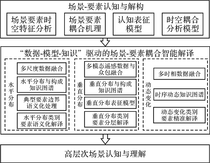 在数据-模型-知识驱动和引导下,分析场景要素时空关联耦合关系,建立场景要素耦合知识表达模型(图 1),实现场景要素关系的认知、表达和推理,以及更高级别的影像理解是当前迫切需要解决的问题。