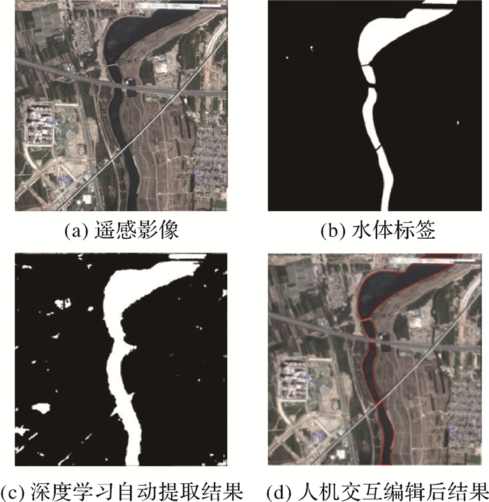 以水体提取为例,后台运用深度学习方法自动提取水体,但其结果存在毛边现象,边界吻合度与生产要求有差距,则前台进行人机交互编辑修改,形成满足生产要求的成果,水体提取示例如图 7所示。