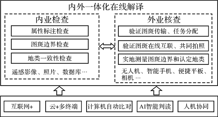 2.4 内外一体与三维环境解译针对疑似图斑判读、质量检查与解译成果核查等问题,采用“互联网+”新技术、“云+多终端”服务架构[33],构建“互联网+”内外一体化在线解译平台,实现内外无缝对接,确保数据真实准确(图 8)。利用无人机组网监测、超分辨率相机视频监测、移动智能感知、卫星动态导航定位等技术,研究内外一体在线解译模式,攻克计算机自动比对、AI智能判读、人机协同等技术,根据影像、照片、视频、数据库进行属性标注、图斑边界检查、地类一致性检查等内业核查工作,提高内业解译效率;外业共同拍照、实地测量图斑边界和认定地类,传输到内业进行核查。通过内外业务协同、互联互通、在线视频互联,实现自然资源要素解译的线上联动、全程监控,提高解译成果的质量及整体效率。